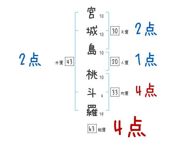 天運![]() | 宮城島桃斗羅さんの天運は30画の2つ星!浮き沈みの激しさに注意しましょう。 家系が持つ宿命的な運勢を表します。祖先から受け継いだ苗字ですので自分の力が及びません。家柄を象徴します。 |