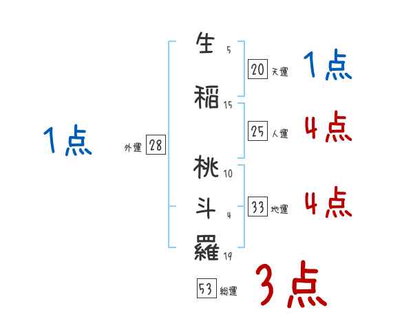 総運![]() | 生稲桃斗羅さんの総運は53画の3つ星!やや見栄っ張りで虚栄心がある。散財に注意。 あなたの人生を表す1番重要な運勢です。生涯を通じて影響する総合運となり、主に50歳以降の晩年期に影響を及ぼします。 |
