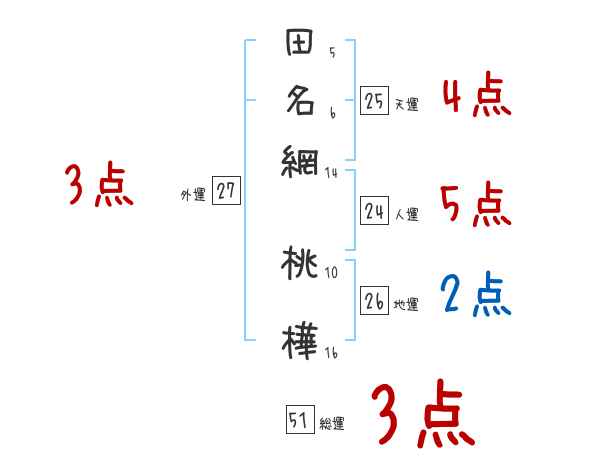 天運![]() | 田名網桃樺さんの天運は25画の4つ星!個性があり才能があふれる。強運の持ち主で発展する。 家系が持つ宿命的な運勢を表します。祖先から受け継いだ苗字ですので自分の力が及びません。家柄を象徴します。 |