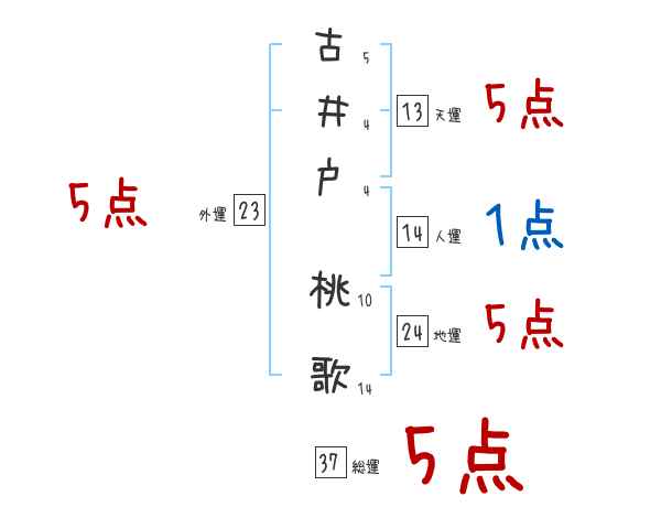 天運![]() | 古井戸桃歌さんの天運は13画の5つ星!才能に恵まれ人気がある。名声を手に入れる。円満な人生。 家系が持つ宿命的な運勢を表します。祖先から受け継いだ苗字ですので自分の力が及びません。家柄を象徴します。 |