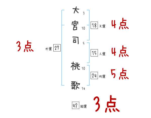 天運![]() | 大宮司桃歌さんの天運は18画の4つ星!情熱的で剛気。忍耐力があり信頼される。 家系が持つ宿命的な運勢を表します。祖先から受け継いだ苗字ですので自分の力が及びません。家柄を象徴します。 |