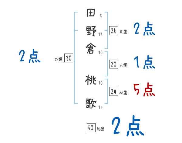外運![]() | 田野倉桃歌さんの外運は30画の2つ星!浮き沈みの激しさに注意しましょう。 生活面を象徴する運勢です。外部から受ける影響力を表し、結婚運、家庭運や職場、環境への順応性を表します。 |