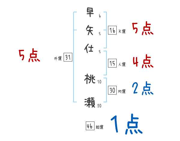天運![]() | 早矢仕桃瀬さんの天運は16画の5つ星!人望が厚く大きく発展する。逆転成功が見える。 家系が持つ宿命的な運勢を表します。祖先から受け継いだ苗字ですので自分の力が及びません。家柄を象徴します。 |