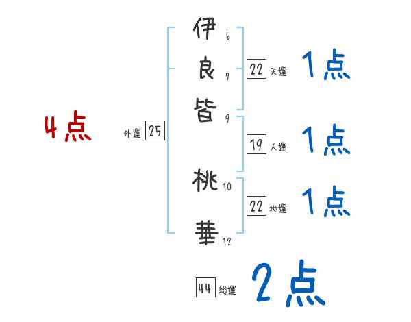 総運![]() | 伊良皆桃華さんの総運は44画の2つ星!誠実で慎重な性格。物事を考えすぎないように注意しましょう。 あなたの人生を表す1番重要な運勢です。生涯を通じて影響する総合運となり、主に50歳以降の晩年期に影響を及ぼします。 |