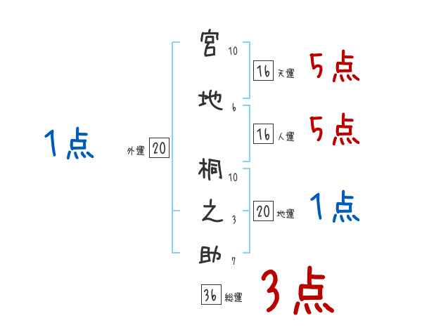 総運![]() | 宮地桐之助さんの総運は36画の3つ星!先見性が豊かです。多少神経質で苦労することも。 あなたの人生を表す1番重要な運勢です。生涯を通じて影響する総合運となり、主に50歳以降の晩年期に影響を及ぼします。 |