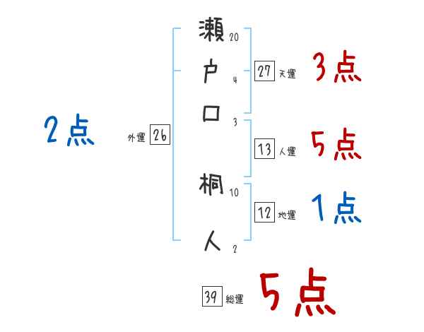 総運![]() | 瀬戸口桐人さんの総運は39画の5つ星!社交性に優れ人望が厚い。人の上に立ち成功する。 あなたの人生を表す1番重要な運勢です。生涯を通じて影響する総合運となり、主に50歳以降の晩年期に影響を及ぼします。 |