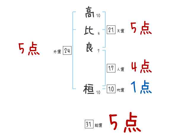 天運![]() | 高比良桓さんの天運は21画の5つ星!統率力がある。独立し成功する。名誉を手に入れる。 家系が持つ宿命的な運勢を表します。祖先から受け継いだ苗字ですので自分の力が及びません。家柄を象徴します。 |
