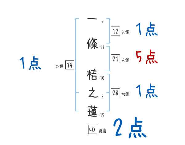 地運![]() | 一條桔之蓮さんの地運は28画の1つ星!家庭環境に注意。スポーツで活躍できる能力があるかも。 個性を表す基礎的な運勢です。性格形成や対人関係、行動力など家庭環境に影響されます。主に誕生してから20歳くらいまでの若年期の運勢を表します。 |