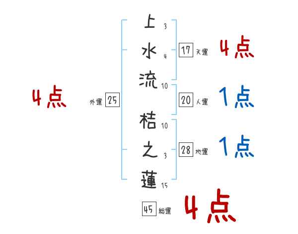総運![]() | 上水流桔之蓮さんの総運は45画の4つ星!もくもくと物事を進め達成する。地味な努力家。 あなたの人生を表す1番重要な運勢です。生涯を通じて影響する総合運となり、主に50歳以降の晩年期に影響を及ぼします。 |
