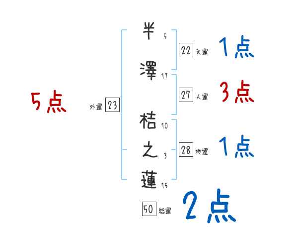 外運![]() | 半澤桔之蓮さんの外運は23画の5つ星!想像力に優れ活力がある。一代で成功し名誉を手に入れる。 生活面を象徴する運勢です。外部から受ける影響力を表し、結婚運、家庭運や職場、環境への順応性を表します。 |