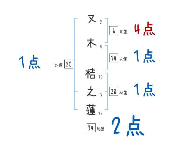天運![]() | 又木桔之蓮さんの天運は6画の4つ星!慎重な努力家で信頼を得る。誠実な精神で向上心に優れる。 家系が持つ宿命的な運勢を表します。祖先から受け継いだ苗字ですので自分の力が及びません。家柄を象徴します。 |
