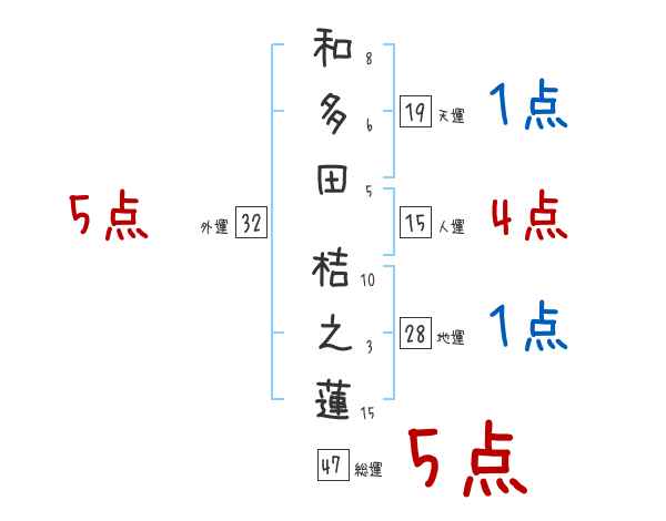 外運![]() | 和多田桔之蓮さんの外運は32画の5つ星!柔軟性があり成功する。チャンスが多く金運が良い。 生活面を象徴する運勢です。外部から受ける影響力を表し、結婚運、家庭運や職場、環境への順応性を表します。 |