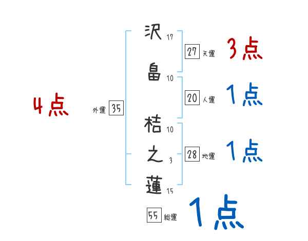 外運![]() | 沢畠桔之蓮さんの外運は35画の4つ星!温厚な性格で感受性が高い。穏和な性格で人望が厚い。 生活面を象徴する運勢です。外部から受ける影響力を表し、結婚運、家庭運や職場、環境への順応性を表します。 |
