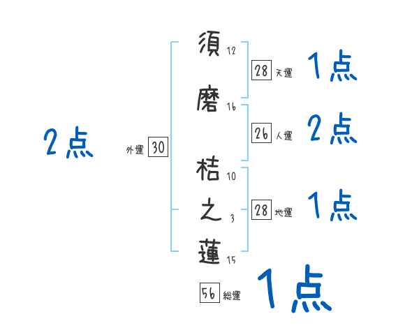 天運![]() | 須磨桔之蓮さんの天運は28画の1つ星!家庭環境に注意。スポーツで活躍できる能力があるかも。 家系が持つ宿命的な運勢を表します。祖先から受け継いだ苗字ですので自分の力が及びません。家柄を象徴します。 |