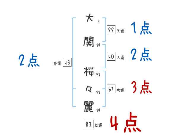 天運![]() | 大関桜々麗さんの天運は22画の1つ星!努力することが苦手ないっぽう手先が器用。芸術性にも優れる。 家系が持つ宿命的な運勢を表します。祖先から受け継いだ苗字ですので自分の力が及びません。家柄を象徴します。 |