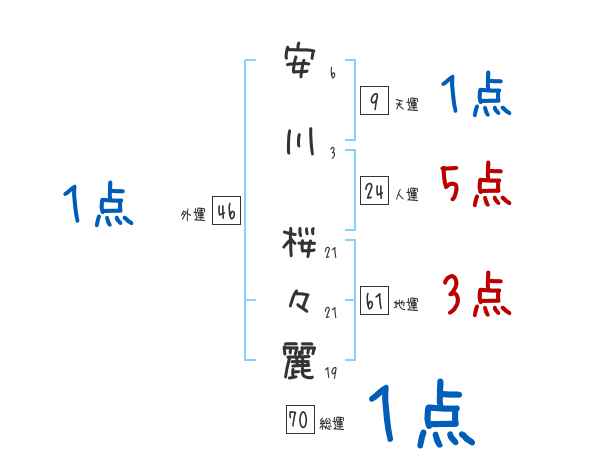 天運![]() | 安川桜々麗さんの天運は9画の1つ星!消極的で才能を発揮することが苦手なことも。周りの意見に耳を傾けましょう。 家系が持つ宿命的な運勢を表します。祖先から受け継いだ苗字ですので自分の力が及びません。家柄を象徴します。 |