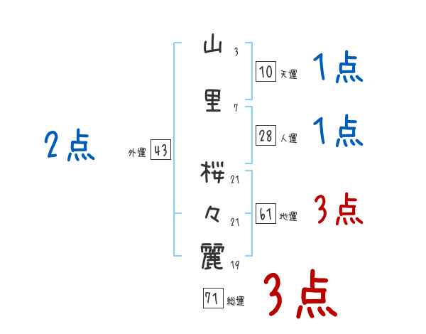 天運![]() | 山里桜々麗さんの天運は10画の1つ星!不安を感じやすい傾向。ストレスを抱えないように注意しましょう。 家系が持つ宿命的な運勢を表します。祖先から受け継いだ苗字ですので自分の力が及びません。家柄を象徴します。 |