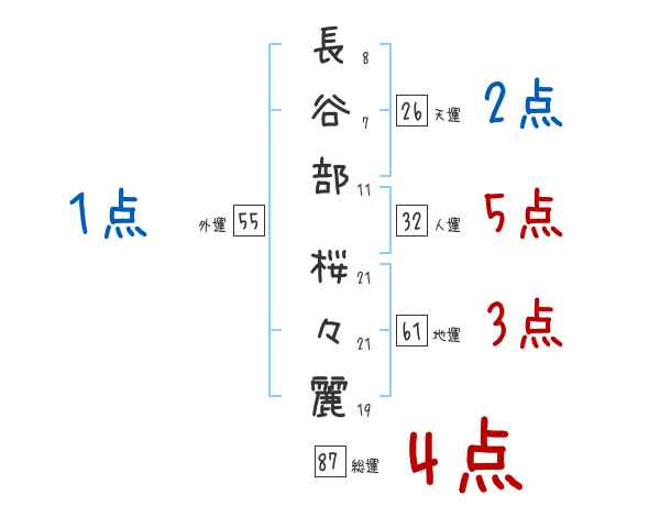 人運![]() | 長谷部桜々麗さんの人運は32画の5つ星!柔軟性があり成功する。チャンスが多く金運が良い。 性格や才能などを表す2番目に重要な運勢です。人間関係や協調性、社会的な成功に影響します。主に20歳から50歳ぐらいまでの中年期の運勢を表します。 |