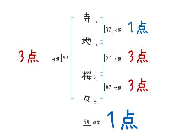 天運![]() | 寺地桜々さんの天運は12画の1つ星!簡単な失敗で諦めてしまいやすいかも。着実に行動すると良いでしょう。 家系が持つ宿命的な運勢を表します。祖先から受け継いだ苗字ですので自分の力が及びません。家柄を象徴します。 |