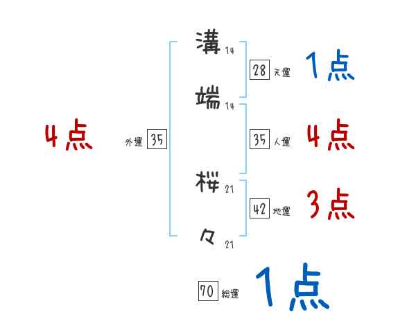 天運![]() | 溝端桜々さんの天運は28画の1つ星!家庭環境に注意。スポーツで活躍できる能力があるかも。 家系が持つ宿命的な運勢を表します。祖先から受け継いだ苗字ですので自分の力が及びません。家柄を象徴します。 |