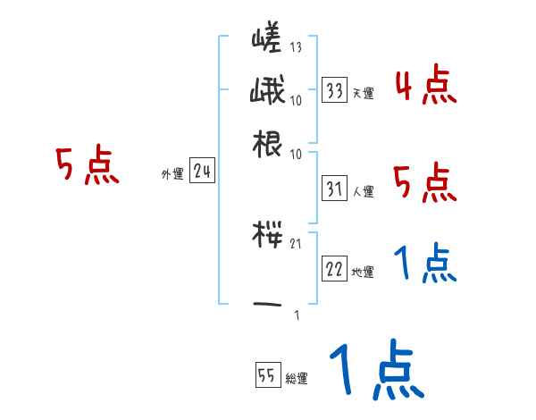 総運![]() | 嵯峨根桜一さんの総運は55画の1つ星!欲張りな性格で軽率な行動に注意しましょう。病気に気をつけて。 あなたの人生を表す1番重要な運勢です。生涯を通じて影響する総合運となり、主に50歳以降の晩年期に影響を及ぼします。 |