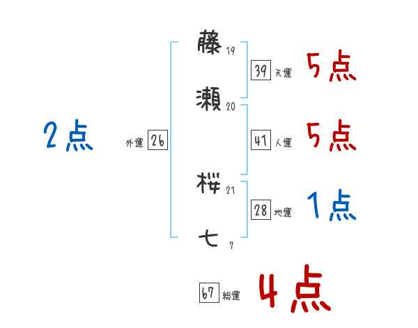 人運![]() | 藤瀬桜七さんの人運は41画の5つ星!大志を抱き、目標に向かって実力を発揮し達成する。温和な性格。 性格や才能などを表す2番目に重要な運勢です。人間関係や協調性、社会的な成功に影響します。主に20歳から50歳ぐらいまでの中年期の運勢を表します。 |