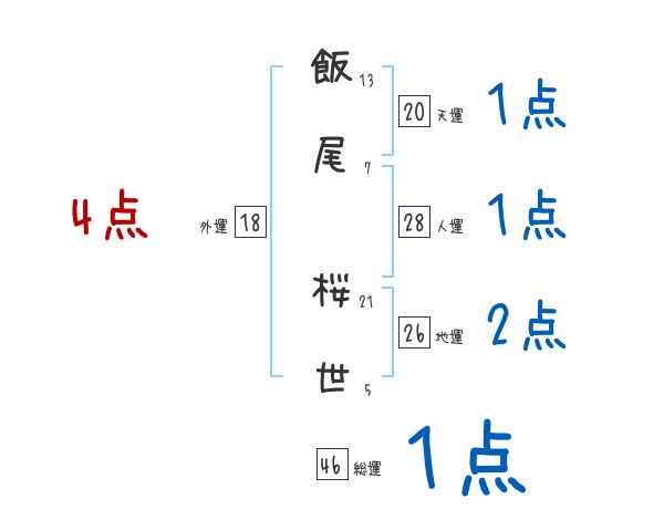 外運![]() | 飯尾桜世さんの外運は18画の4つ星!情熱的で剛気。忍耐力があり信頼される。 生活面を象徴する運勢です。外部から受ける影響力を表し、結婚運、家庭運や職場、環境への順応性を表します。 |