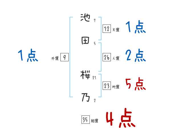 天運![]() | 池田桜乃さんの天運は12画の1つ星!簡単な失敗で諦めてしまいやすいかも。着実に行動すると良いでしょう。 家系が持つ宿命的な運勢を表します。祖先から受け継いだ苗字ですので自分の力が及びません。家柄を象徴します。 |