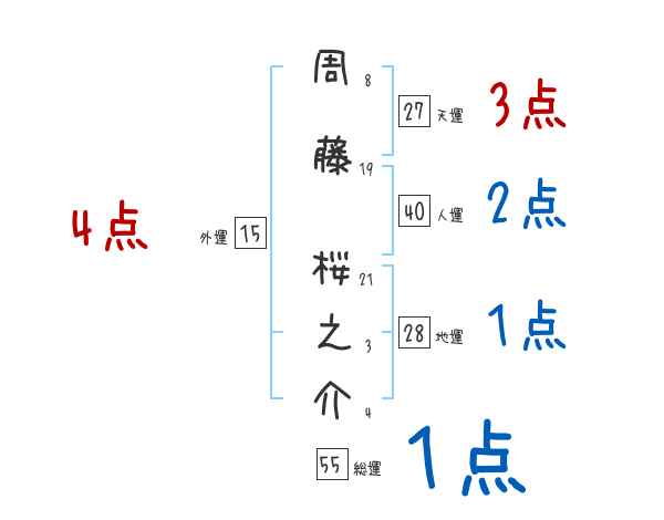 天運![]() | 周藤桜之介さんの天運は27画の3つ星!頭脳明晰だが強情で摩擦が多い傾向。孤立に注意。 家系が持つ宿命的な運勢を表します。祖先から受け継いだ苗字ですので自分の力が及びません。家柄を象徴します。 |