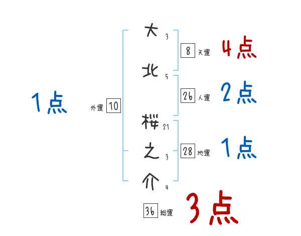 総運![]() | 大北桜之介さんの総運は36画の3つ星!先見性が豊かです。多少神経質で苦労することも。 あなたの人生を表す1番重要な運勢です。生涯を通じて影響する総合運となり、主に50歳以降の晩年期に影響を及ぼします。 |