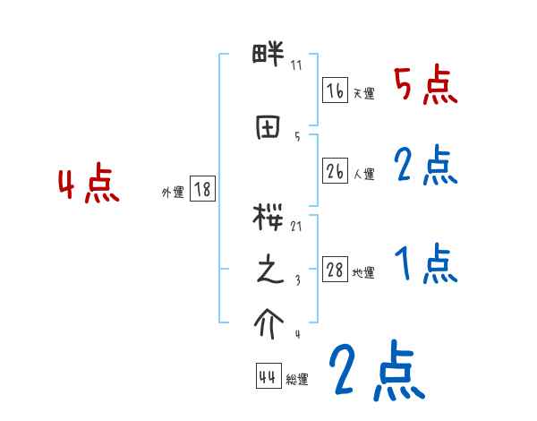 総運![]() | 畔田桜之介さんの総運は44画の2つ星!誠実で慎重な性格。物事を考えすぎないように注意しましょう。 あなたの人生を表す1番重要な運勢です。生涯を通じて影響する総合運となり、主に50歳以降の晩年期に影響を及ぼします。 |
