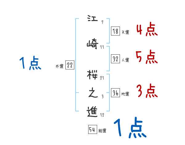 人運![]() | 江崎桜之進さんの人運は32画の5つ星!柔軟性があり成功する。チャンスが多く金運が良い。 性格や才能などを表す2番目に重要な運勢です。人間関係や協調性、社会的な成功に影響します。主に20歳から50歳ぐらいまでの中年期の運勢を表します。 |