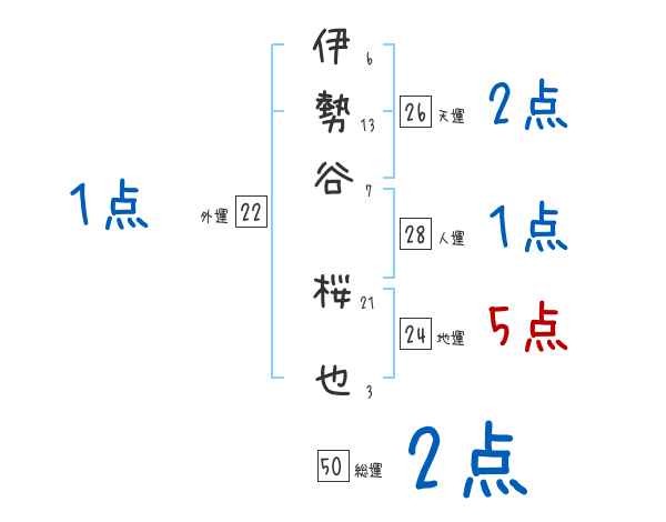 天運![]() | 伊勢谷桜也さんの天運は26画の2つ星!波瀾万丈かも。信頼できる人を大事にしましょう。 家系が持つ宿命的な運勢を表します。祖先から受け継いだ苗字ですので自分の力が及びません。家柄を象徴します。 |
