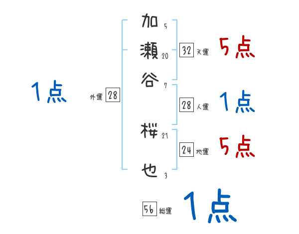 天運![]() | 加瀬谷桜也さんの天運は32画の5つ星!柔軟性があり成功する。チャンスが多く金運が良い。 家系が持つ宿命的な運勢を表します。祖先から受け継いだ苗字ですので自分の力が及びません。家柄を象徴します。 |