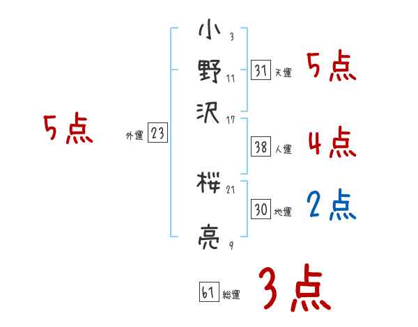 外運![]() | 小野沢桜亮さんの外運は23画の5つ星!想像力に優れ活力がある。一代で成功し名誉を手に入れる。 生活面を象徴する運勢です。外部から受ける影響力を表し、結婚運、家庭運や職場、環境への順応性を表します。 |