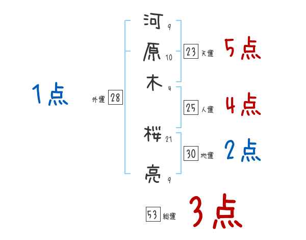 総運![]() | 河原木桜亮さんの総運は53画の3つ星!やや見栄っ張りで虚栄心がある。散財に注意。 あなたの人生を表す1番重要な運勢です。生涯を通じて影響する総合運となり、主に50歳以降の晩年期に影響を及ぼします。 |