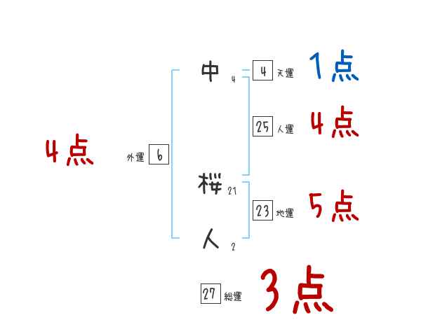 人運![]() | 中桜人さんの人運は25画の4つ星!個性があり才能があふれる。強運の持ち主で発展する。 性格や才能などを表す2番目に重要な運勢です。人間関係や協調性、社会的な成功に影響します。主に20歳から50歳ぐらいまでの中年期の運勢を表します。 |