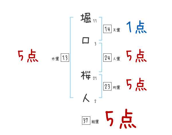 天運![]() | 堀口桜人さんの天運は14画の1つ星!人に対して優しいがストレスを溜め込みがち。人間関係のトラブルを避けるよう気をつけましょう。 家系が持つ宿命的な運勢を表します。祖先から受け継いだ苗字ですので自分の力が及びません。家柄を象徴します。 |