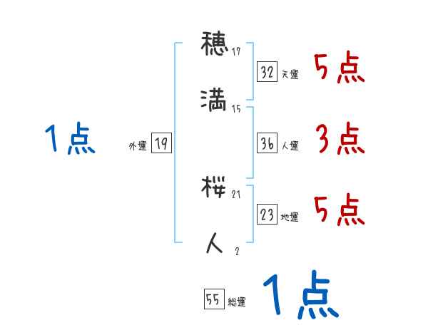 天運![]() | 穂満桜人さんの天運は32画の5つ星!柔軟性があり成功する。チャンスが多く金運が良い。 家系が持つ宿命的な運勢を表します。祖先から受け継いだ苗字ですので自分の力が及びません。家柄を象徴します。 |