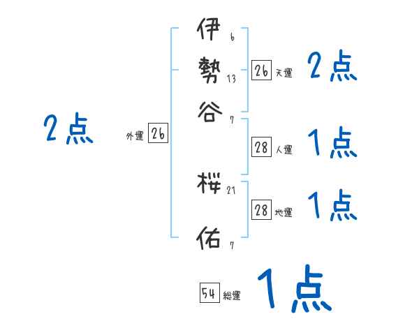 天運![]() | 伊勢谷桜佑さんの天運は26画の2つ星!波瀾万丈かも。信頼できる人を大事にしましょう。 家系が持つ宿命的な運勢を表します。祖先から受け継いだ苗字ですので自分の力が及びません。家柄を象徴します。 |