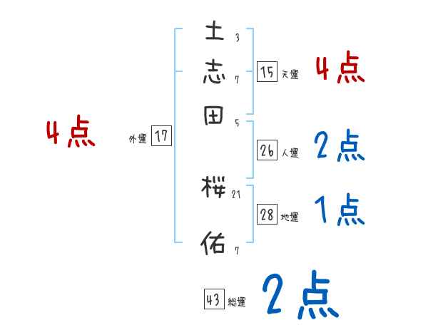外運![]() | 土志田桜佑さんの外運は17画の4つ星!積極的な行動力。地位を気づき財産を手に入れる。純粋な心と直感力。 生活面を象徴する運勢です。外部から受ける影響力を表し、結婚運、家庭運や職場、環境への順応性を表します。 |