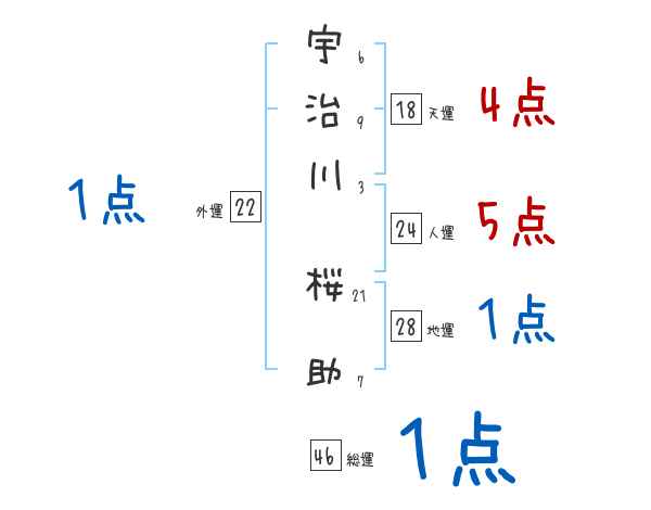 天運![]() | 宇治川桜助さんの天運は18画の4つ星!情熱的で剛気。忍耐力があり信頼される。 家系が持つ宿命的な運勢を表します。祖先から受け継いだ苗字ですので自分の力が及びません。家柄を象徴します。 |