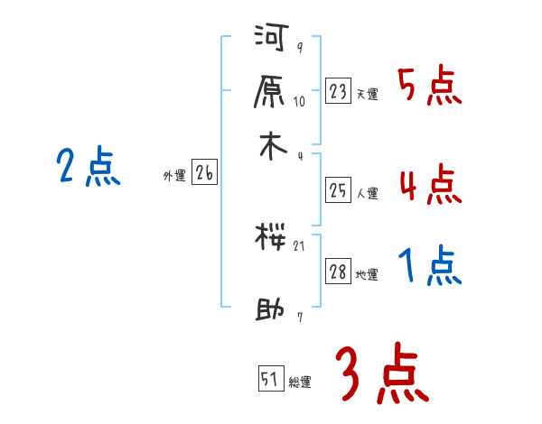 外運![]() | 河原木桜助さんの外運は26画の2つ星!波瀾万丈かも。信頼できる人を大事にしましょう。 生活面を象徴する運勢です。外部から受ける影響力を表し、結婚運、家庭運や職場、環境への順応性を表します。 |