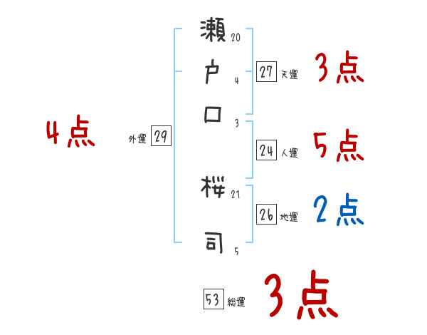 総運![]() | 瀬戸口桜司さんの総運は53画の3つ星!やや見栄っ張りで虚栄心がある。散財に注意。 あなたの人生を表す1番重要な運勢です。生涯を通じて影響する総合運となり、主に50歳以降の晩年期に影響を及ぼします。 |