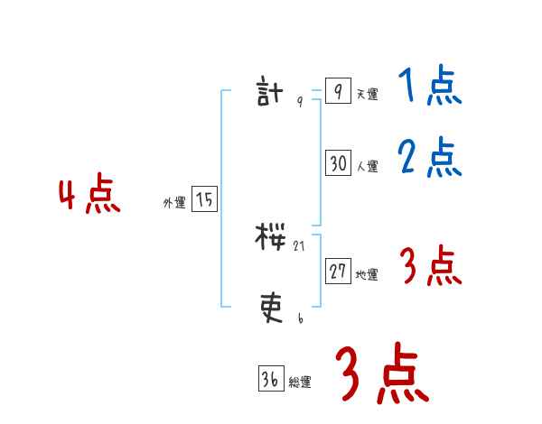 天運![]() | 計桜吏さんの天運は9画の1つ星!消極的で才能を発揮することが苦手なことも。周りの意見に耳を傾けましょう。 家系が持つ宿命的な運勢を表します。祖先から受け継いだ苗字ですので自分の力が及びません。家柄を象徴します。 |