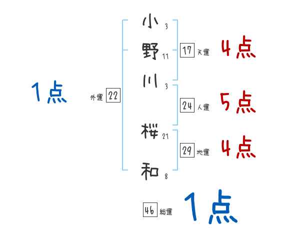 天運![]() | 小野川桜和さんの天運は17画の4つ星!積極的な行動力。地位を気づき財産を手に入れる。純粋な心と直感力。 家系が持つ宿命的な運勢を表します。祖先から受け継いだ苗字ですので自分の力が及びません。家柄を象徴します。 |