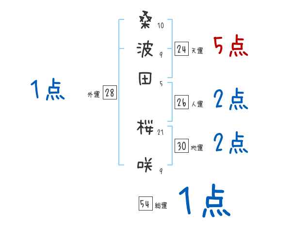 天運![]() | 桑波田桜咲さんの天運は24画の5つ星!家庭運が良く順調な人生。金運にも恵まれる。 家系が持つ宿命的な運勢を表します。祖先から受け継いだ苗字ですので自分の力が及びません。家柄を象徴します。 |