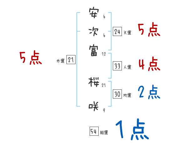 天運![]() | 安次富桜咲さんの天運は24画の5つ星!家庭運が良く順調な人生。金運にも恵まれる。 家系が持つ宿命的な運勢を表します。祖先から受け継いだ苗字ですので自分の力が及びません。家柄を象徴します。 |