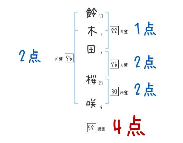 外運![]() | 鈴木田桜咲さんの外運は26画の2つ星!波瀾万丈かも。信頼できる人を大事にしましょう。 生活面を象徴する運勢です。外部から受ける影響力を表し、結婚運、家庭運や職場、環境への順応性を表します。 |