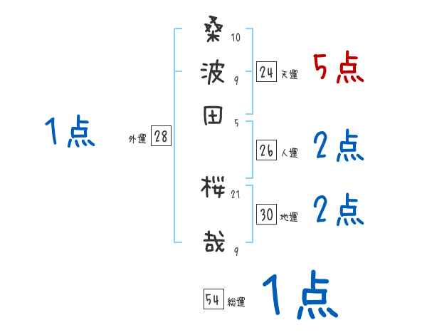 天運![]() | 桑波田桜哉さんの天運は24画の5つ星!家庭運が良く順調な人生。金運にも恵まれる。 家系が持つ宿命的な運勢を表します。祖先から受け継いだ苗字ですので自分の力が及びません。家柄を象徴します。 |